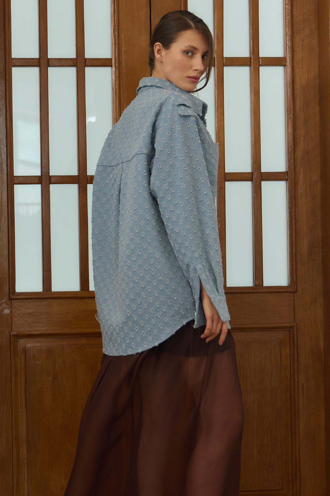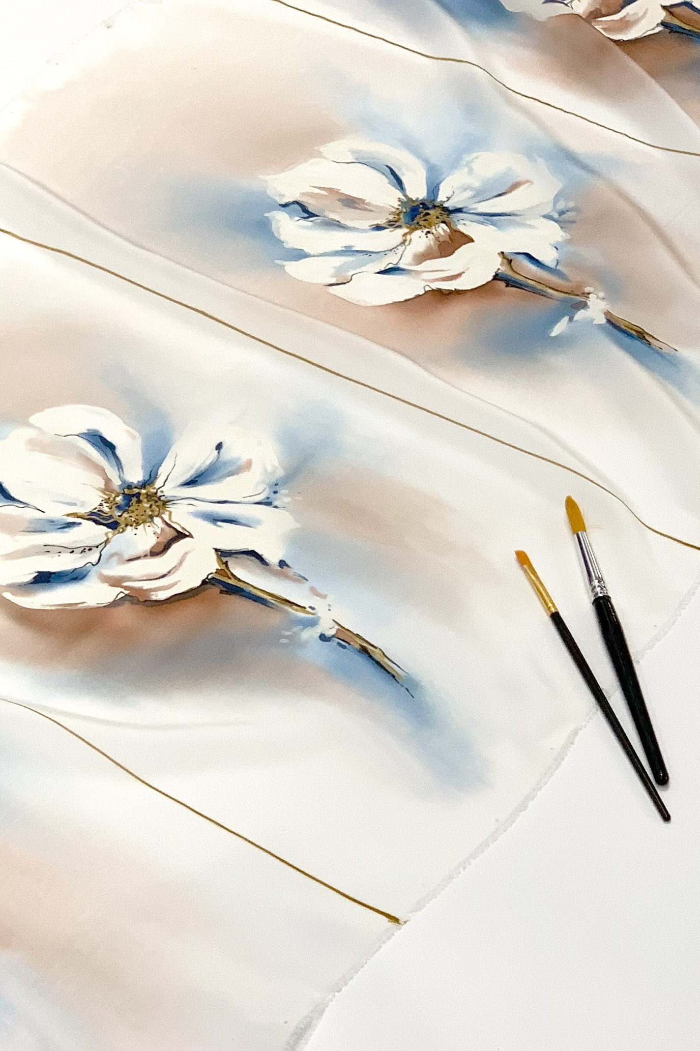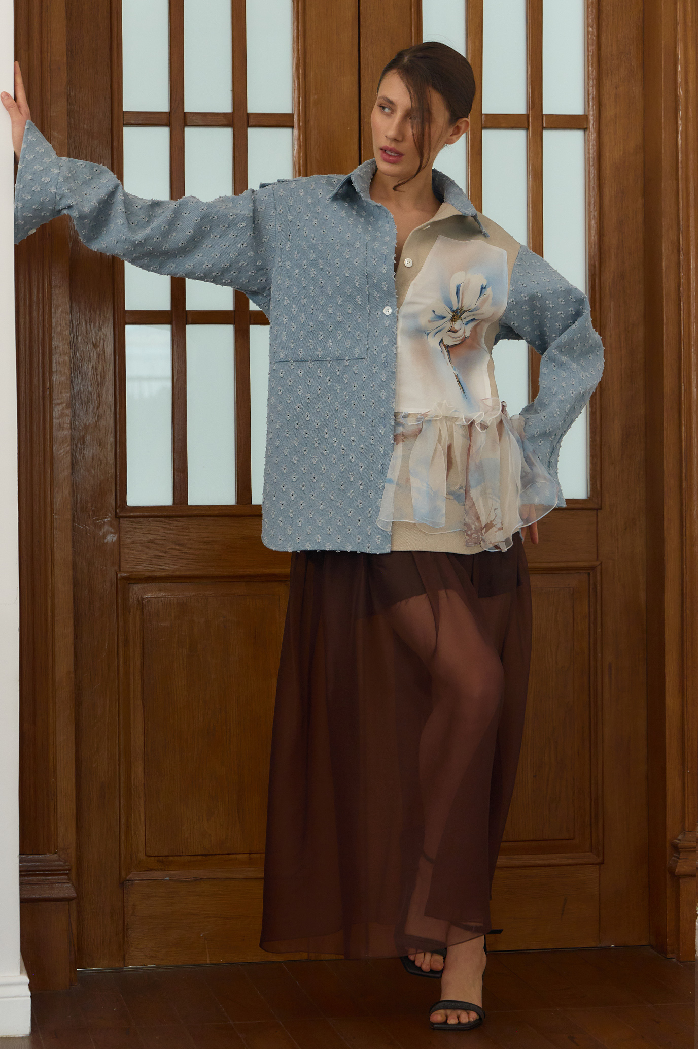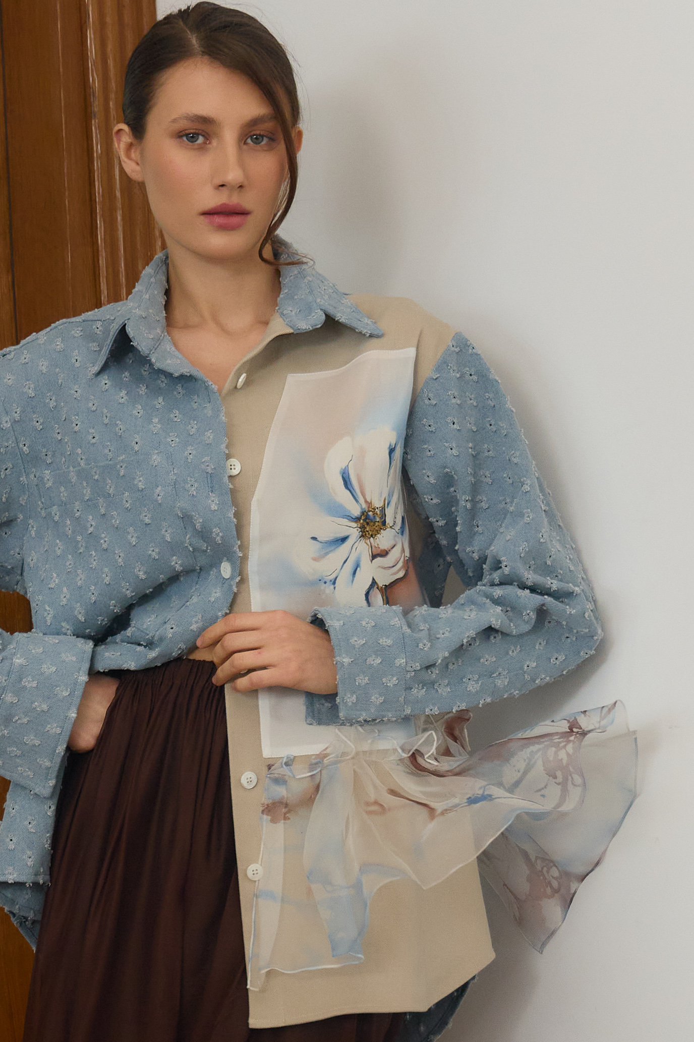 Рубашка-куртка свободного кроя из фактурной хлопковой джинсы с картиной на натуральном шелке ручной росписи Fleur