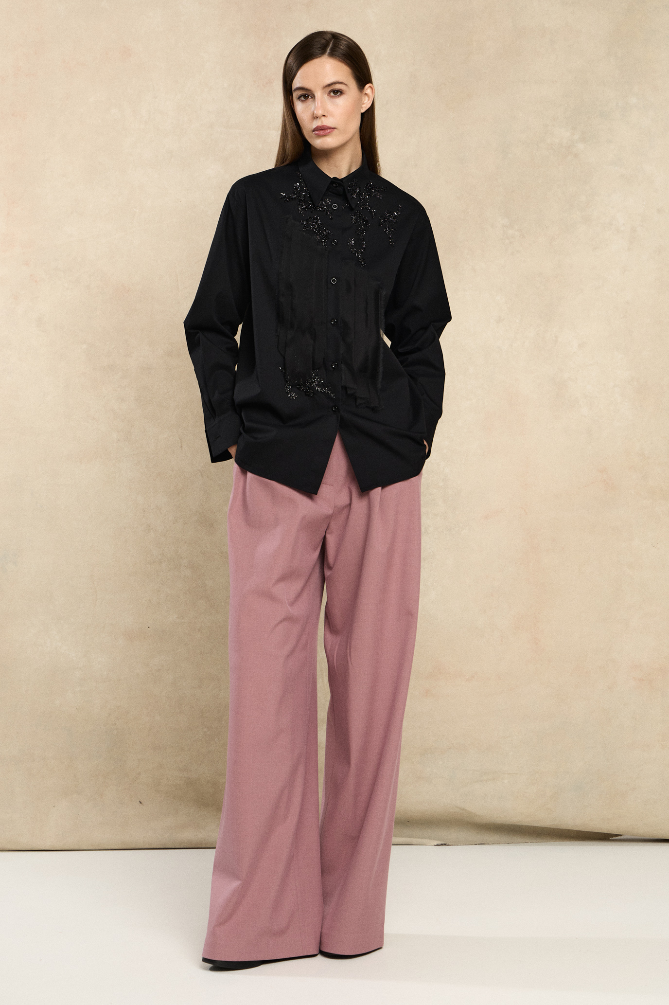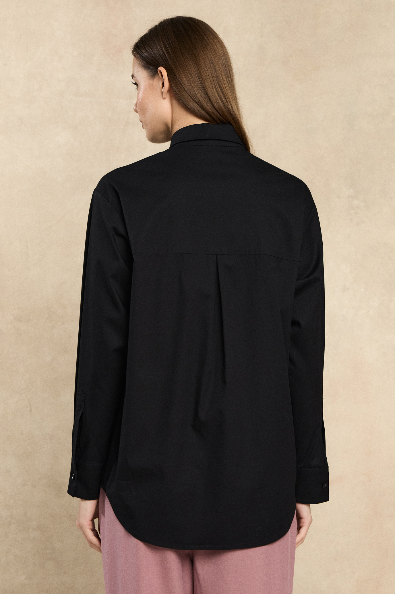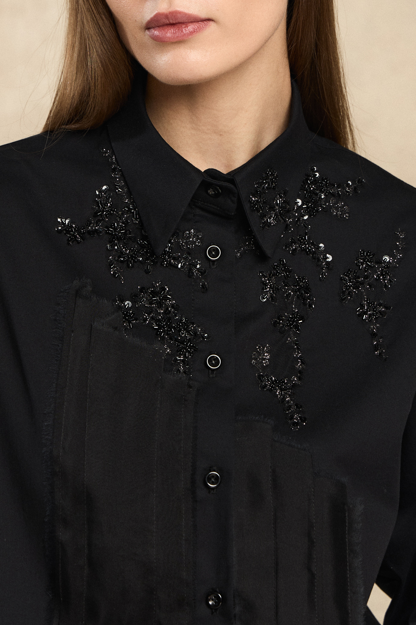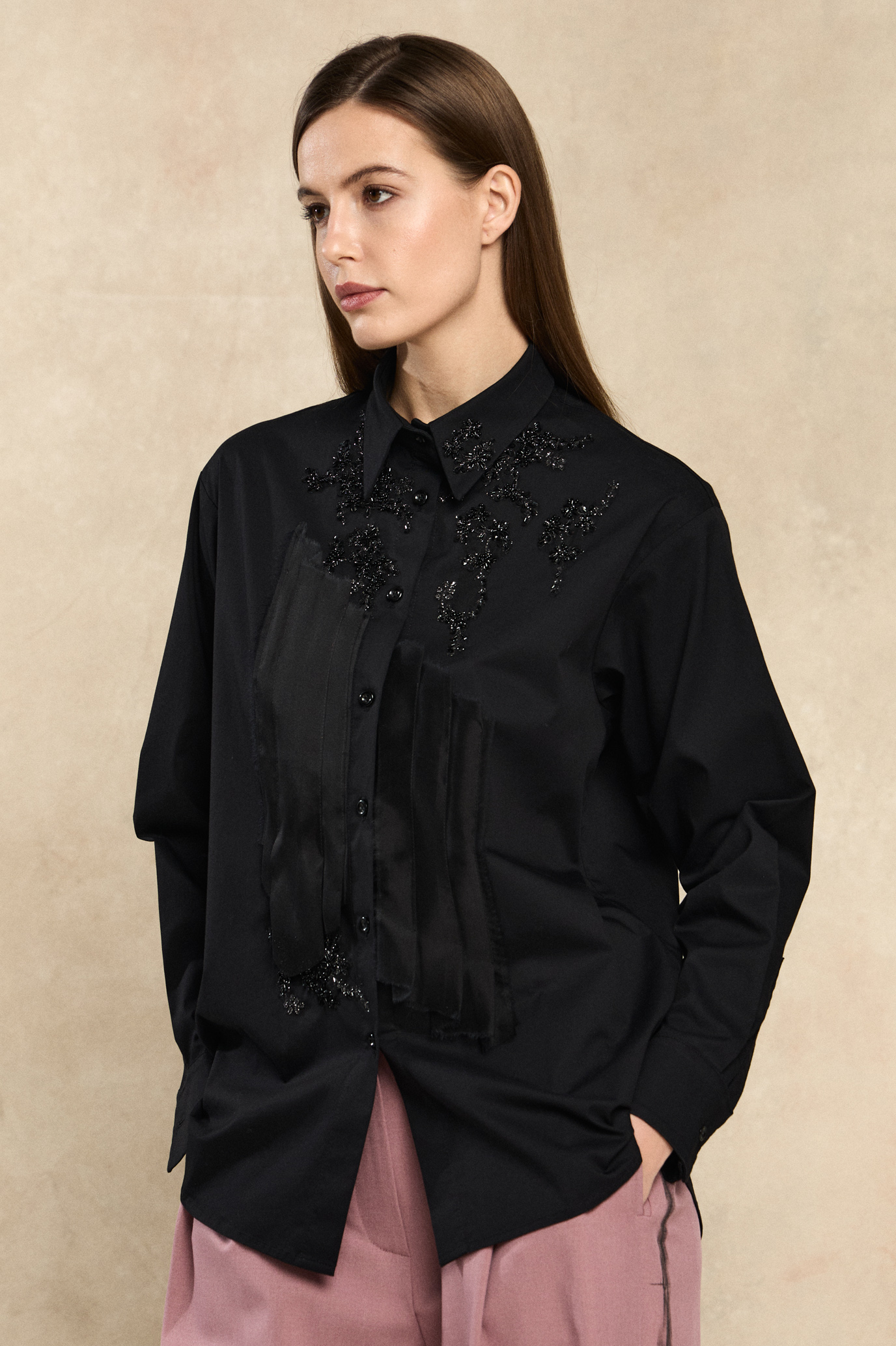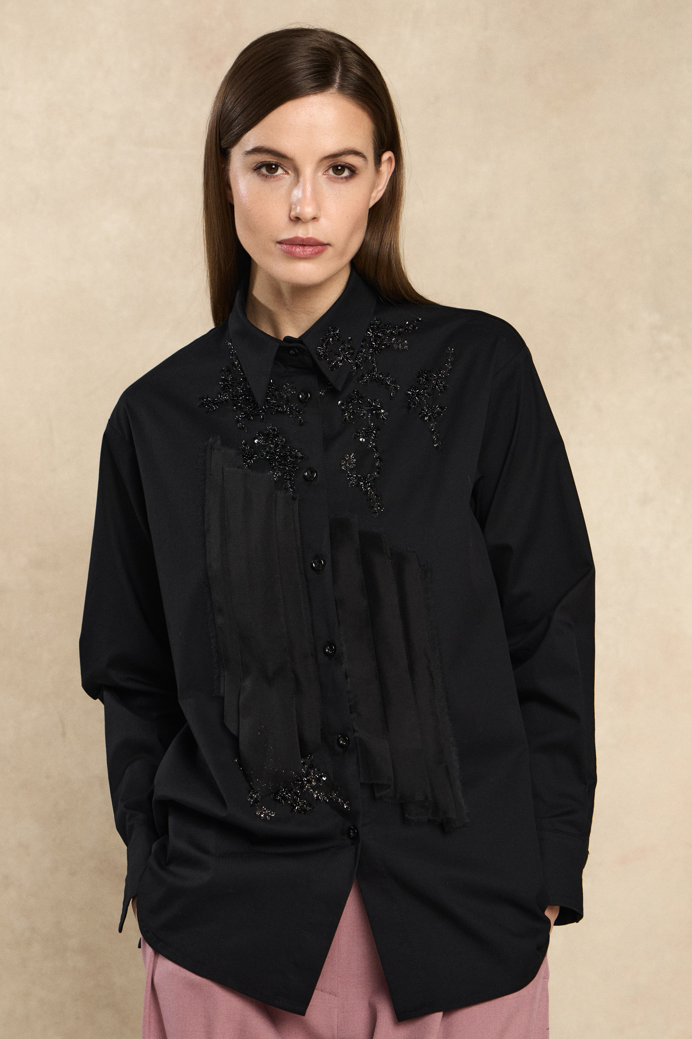 Описание Черная рубашка из хлопка с ручной вышивкой Размер S-M Полуобхват в груди 56 см состав: хлопок 90%, нейлон 10%