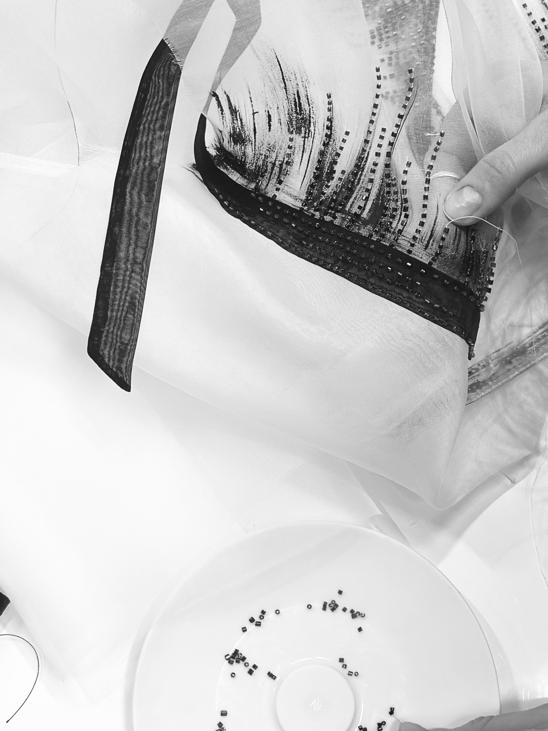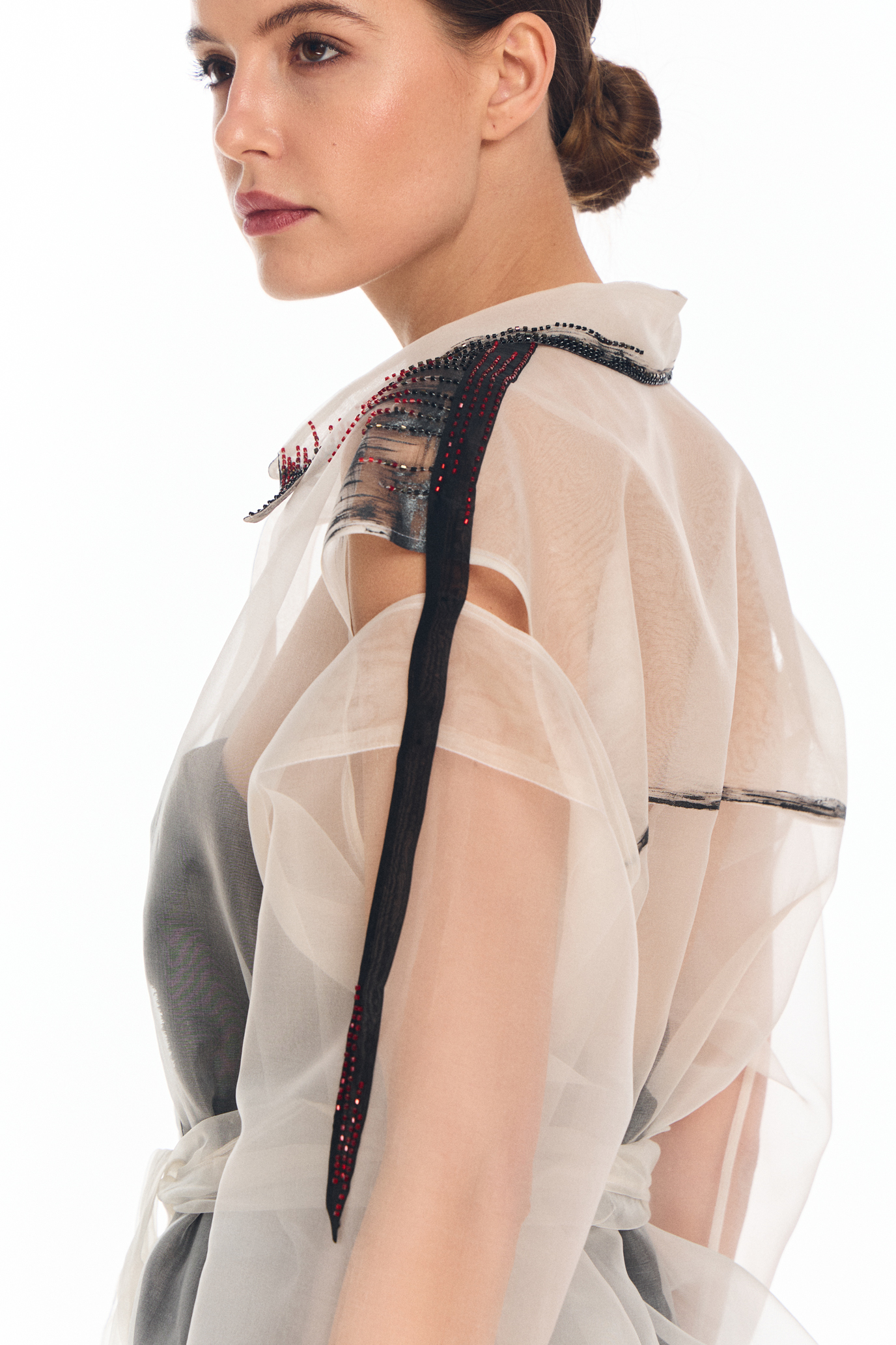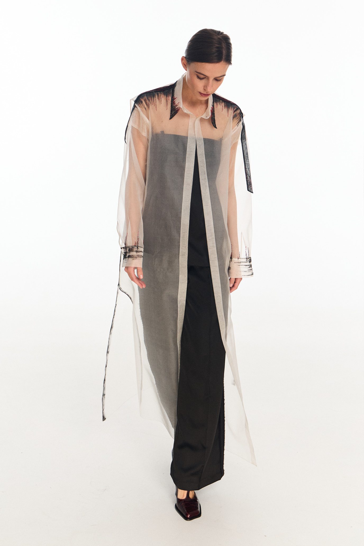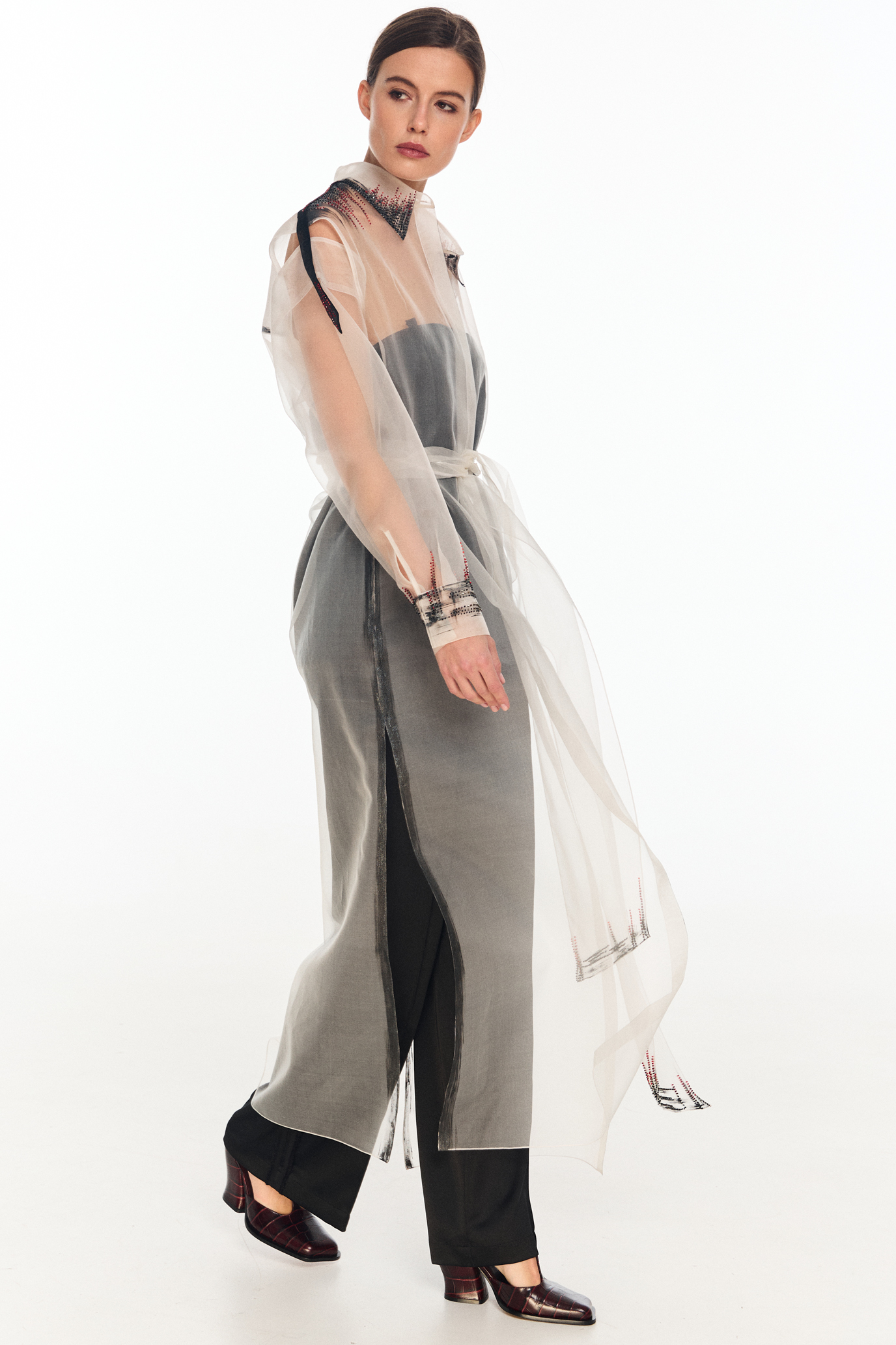 Женская прозрачная удлиненная рубашка из натурального шелка с ручной росписью и вышивкой
